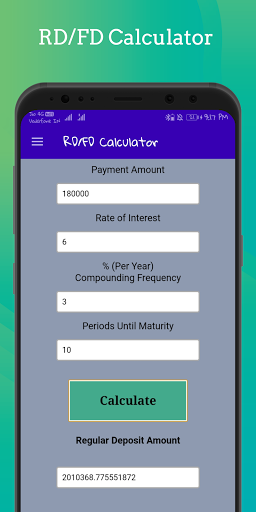 opposed to using a complicated FD calculation formula, you can use the regular deposit/fixed deposit calculator app to know your returns beforehand in just a few seconds.