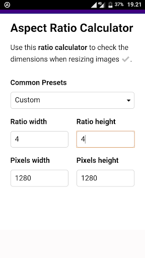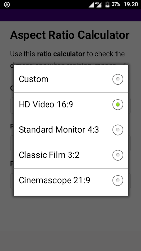 The Calculator Aspect Ratio allows you to calculate aspect ratios or use an aspect ratio to calculate sizes.