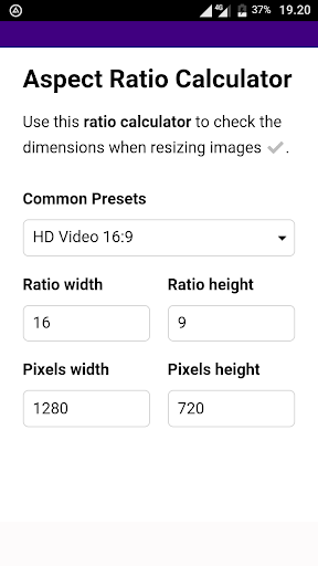 Calculator Aspect Ratio is a very simple and useful tool that makes it easy for you to calculate dimensions to re-size image or video.
