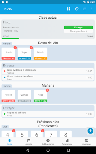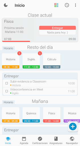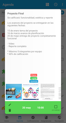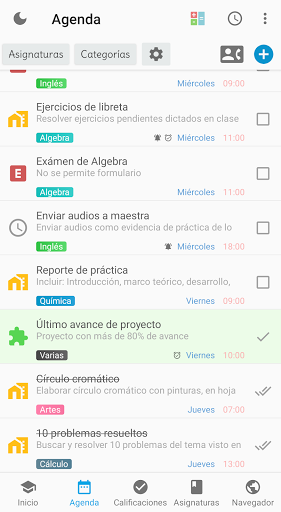 - 귀하의 의존 활동의 현재 상태 (보류 중, 완료, 전달)를 식별 - - 의제 활동 및 다가오는 수업의 미리 알림 (알림 및 알람)을 생성합니다. - 하루 경보 관리 | - 폴더의 모든 학교 사진 좋은 조직을 유지하기 위해 - 자세한 도움 요약 (추론, 가능한 오류, 누적 된 오류, 결함, 사용 가능한 결함 이후의 백분율, 총 클래스, 축적 된 오류, 사용 가능한 오류) - 자동으로 계산 된 경우, 특정 최종 등급