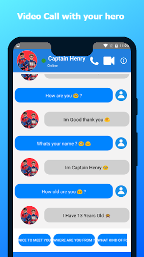 Captain Henry call video call application to accompany your days in your free time when you feel lonelyand boring then entertain yourself with fake calls from your idol. this application to simulation a fake chat messenger with a fake call and video call, we add option to start live with your Captain Henry, to look a real chat messenger live. all this just for prank your friends or your family to make a fake chat with favorite stars Captain Henry to be a real chat, you have three option to connect with Captain Henry Call try this app Captain Henry calling voice, Captain Henry live chat or ENJOY WITH Captain Henry calling video.