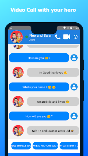Swan et Neo call video call application to accompany your days in your free time when you feel lonelyand boring then entertain yourself with fake calls from your idol. this application to simulation a fake chat messenger with a fake call and video call, we add option to start live with your Swan et Neo, to look a real chat messenger live. all this just for prank your friends or your family to make a fake chat with favorite stars Swan et Neo to be a real chat, you have three option to connect with Swan et Neo Call try this app Swan et Neo calling voice, Swan et Neo live chat or ENJOY WITH Swan et Neo calling video.