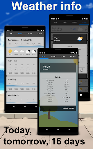 This is a widget for showing the weather condition in real time (not forecast). In particular, it shows the temperature, the condition of wind, humidity, pressure, visibility, and the time of sunrise and sunset.