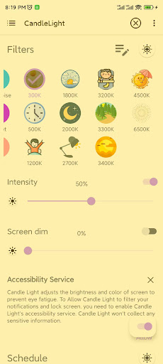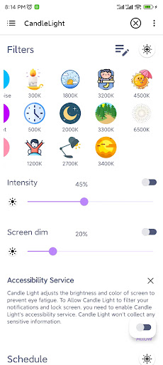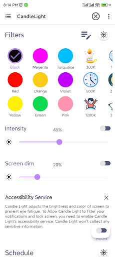 In order to filter also your notifications and lock screen the app may ask for enabling CandleLigh Accessibility Service. The app uses this service only to better filter your screen and does not collect any personal information. You can authorize or cancel at any time.