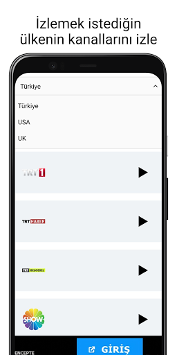 İngliz,Amerikan ve Türk kanallarını Android telefonun üzerinden ücretsiz izle.Birçok haber,spor ve film kanalını bu uygulama üzerinden takip edebilirsin.