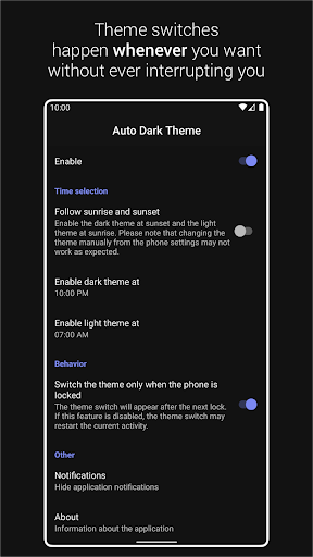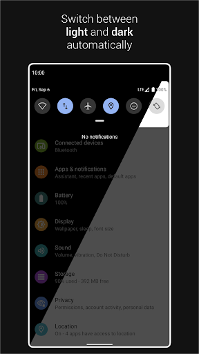 Auto Dark Theme allows you to automatically switch between the light and dark theme of your Android 10. It does so according to sunrise and sunset or according to the time slots of your choice.