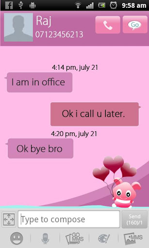 Love Cartoon Romance SMS Theme is cool, romantic and stylish Go SMS theme especially for lovers. Feel the wonder at your Android screen and discover cool romantic sms world. Beautiful background including cute heart balloons and amazing blend of colors like blue, red, purple, pink, yellow and shades of black, white amp; gray. Super Cute Cartoon Love Free GoSMS , including cute little cartoon teddy enjoying beautiful scene of love and romance with lovely colorful balloonsIf you are bored of sharing chocolates, teddy, heart balloons, Valentine day and New year cards then share this lovely SMS Theme with your honey. A unique way of expressing and celebrating your love and care. Get this classic theme with bright, lovely and fresh style to give more lovely and colorful look to your message screen. A beautiful and realistic mood setter for all the lovers Share or gift it to your belovedIf you love heart, cartoon and love, then you will definitely love this beautiful GoSMS MMS contact theme. If you like this HD theme share it with your friends through twitter, facebook and googleplus.How to download and install the message counter plugin?1. For this application to work , you need to have the LATEST version of GO SMS Pro app in search GO SMS Pro to download.2. To apply the theme within GO SMS Pro,download it from Menugt;Settingsgt;Appearance Settingsgt;Theme shopor Plugin UIgt;Theme shop. After downloaded, it will be displayed in quot;Installed themesquot; Tab, click and apply it.Enjoy more powerful and creative SMS function in your Android Mobiles Stay updated since we will be launching more GoSMS themes to the android market for better customization of the android phone. If you like it, then please share it on facebook, have a wonderful tweet on twitter about it, or just simple google 1 it. That will encourage us a lot for providing more better and useful content for our users.The application has been tested extensively on various models of Samsung Galxy, HTC One, HTC Desire and wildfire, sony xperia and Motorola Defy and Motorola Fire,Samsung Galaxy Tab.Download this theme and give completely new style to your android phoneKeywords: sms, simple sms theme, android theme, GO SMS theme, GO SMS Pro theme, go sms cute theme, go sms love theme, heart theme, go sms cartoon theme,go sms romantic theme, free