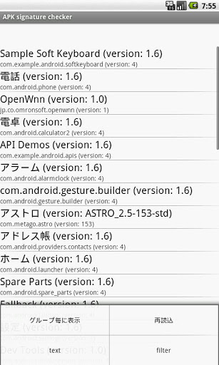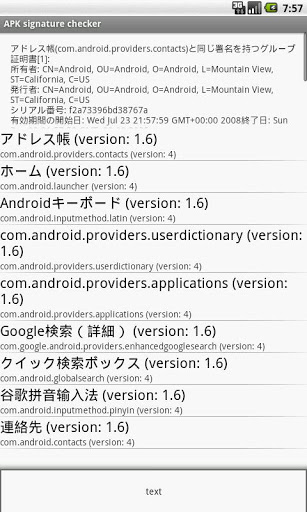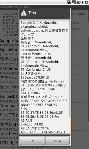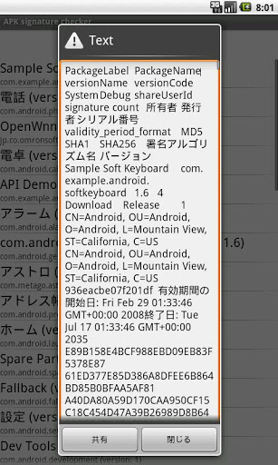 わざわざAPKを取り出してPCでkeytool/jarsigner/openssl等を使用せずとも、Android端末上でアプリの署名情報を確認する事が出来ます。