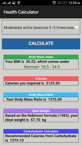 NIN Health Calculator can be used for calculating Body Mass Index(BMI), Calories, Carbohydrates, Body Mass Ratio(BMR) and Ideal Weight in English language.