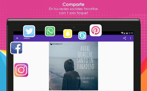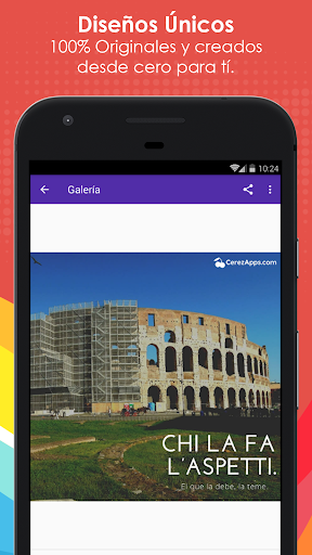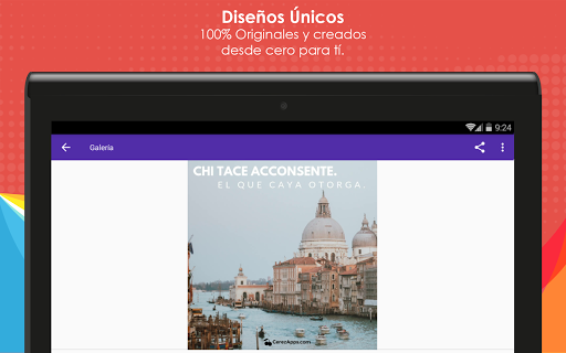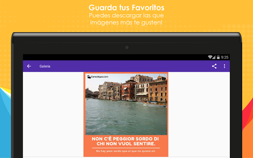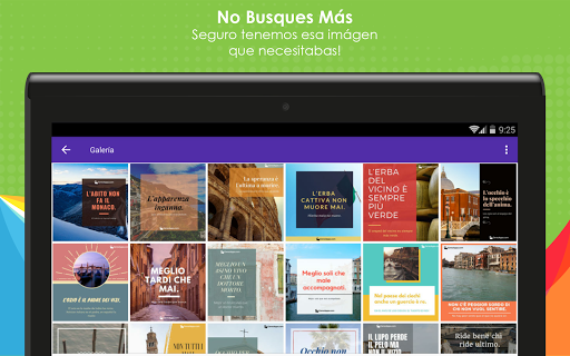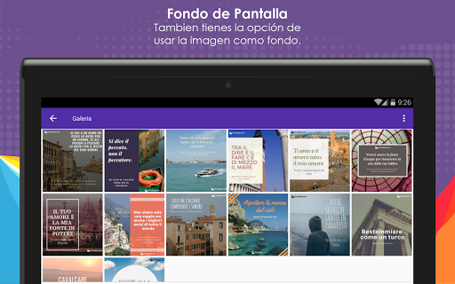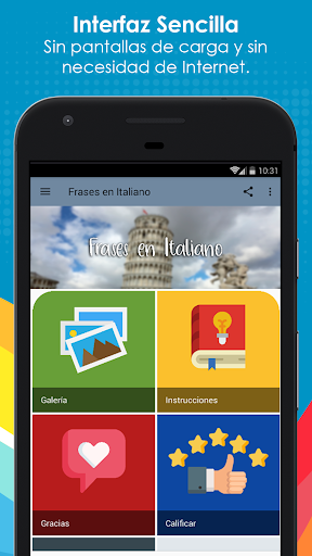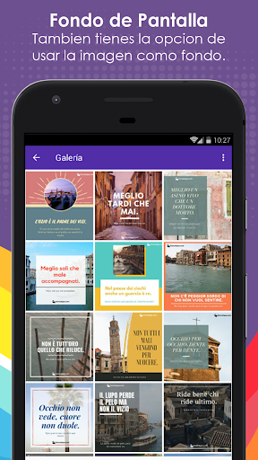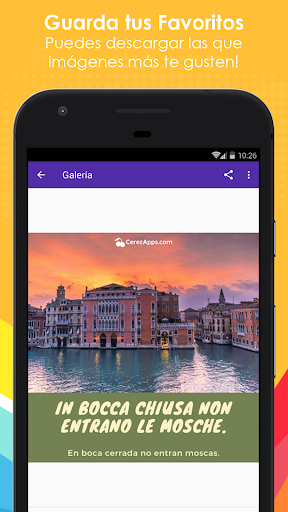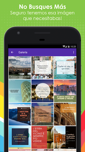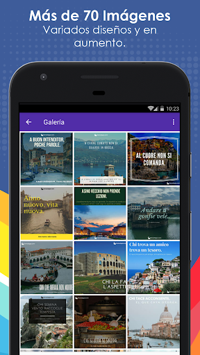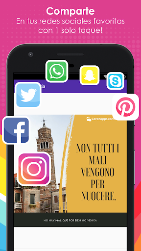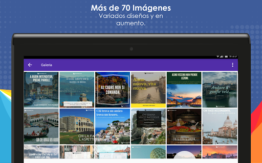 Esta aplicación gratuita de “Frase en Italiano” es perfecta para compartir, difundir y nutrir tus conocimientos. Disfruta de imágenes gratuitas, de libre uso, así como frases de dominio público, para que todos podamos disfrutar de un contenido original y cumplir en todo momento con las normativas.