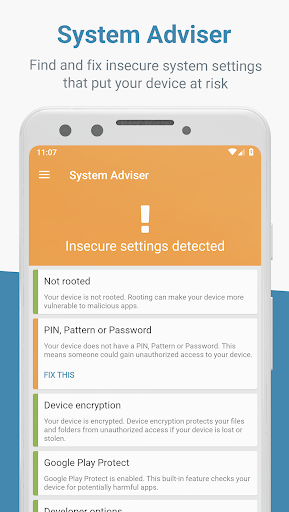- Find and fix insecure system settings that put your device at risk.