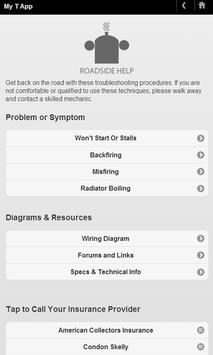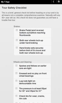 Radiator boiling? Engine misfiring? Car won't start? The My T App offers a quick step-by-step guide to walk you through common problems you may experience while on a tour. And when you get back and running on the road, you have at your fingertips access to weather radars, driving directions, and nearby gas prices. In addition you can pull up a pre-tour safety check list, technical information, historical data, and driving tips.