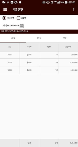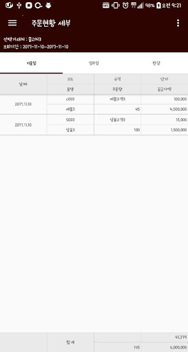 주문 정보 : 실시간 거래처별, 품목별, 주문수량, 주문금액 등 정보 조회