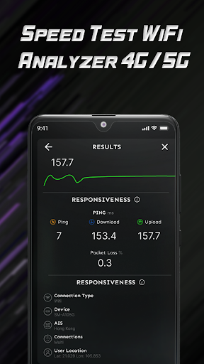 Network Analyzer tells you the parameters of the 5G/4G/wifi network you are using, even 2G/3G Speed Test can also check and analyze internet stats in a very accurate and secure way. Indicators Download, Upload, Ping, Jitter, Loss, ... will help you easily compare internet connections with each other.