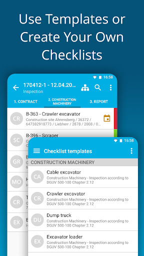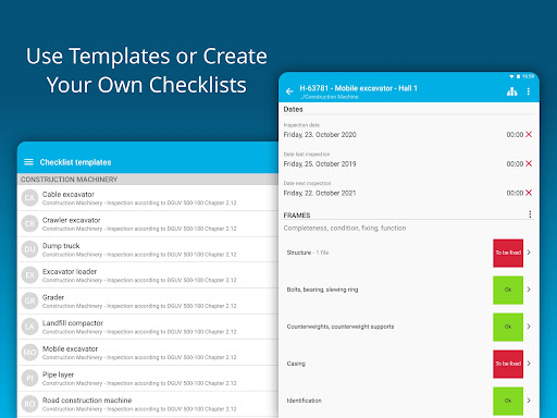 Included templates / checklists: Backhoe loader, trench cutting machine, grader, loader, mobile excavator, dump truck, waste compactor, crawler excavator, pipe layer, scraper, cable excavator, road construction machine, tractor