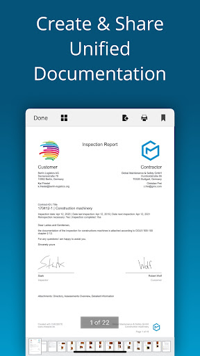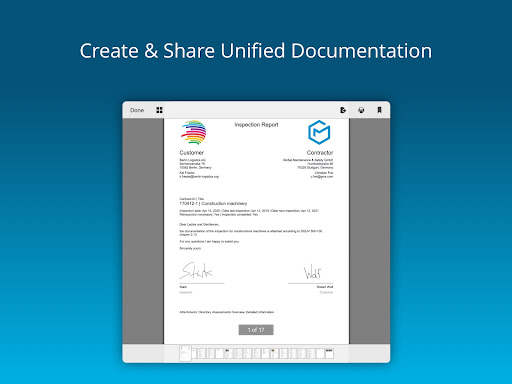 At the end of the process, you create uniform reports and easily share them with your customers and partners, e.g. via cloud services or email. The inspection report contains a management summary of the inspected objects / sites as well as a detailed list of defects and hazards including photos and information, such as required actions and responsibilities.