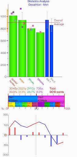 -Highest and lowest event scores highlighted on calculator, stats analysis of all scores.