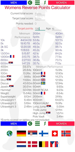 To have other national junior age group events added please send me the country, age group, event order and the scoring formula for events not covered by the World Athletics tables e.g. 75m Hurdles, mens 800m, etc...
