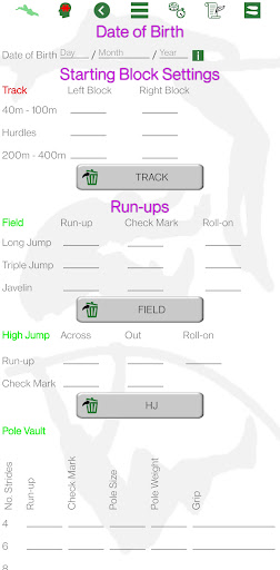 -Save run-ups, block settings, personal bests, season’s bests, combined events bests and training bests for all events, also save bests for various performance tests. Performance test screen includes 1RM calculator.
