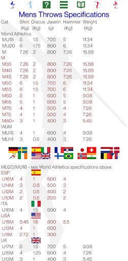 -Hurdles and throwing implement specifications and combined events specific rules available for reference.