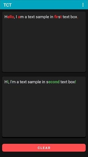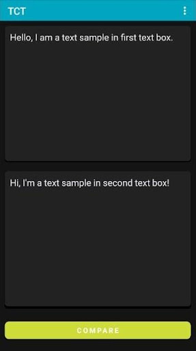 This app is very easy to use. You just need to input 2 text samples in the respective input fields, press the Compare button, and voila! Red color shows the old content in the first text sample, and Green color shows the new content in the second text sample.