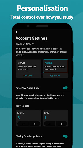 • Enjoy one-tap settings to custom tailor which levels you want to revise, and choose between a session size of 5 to 50 stages. Learn Chinese at your level, at your own pace.