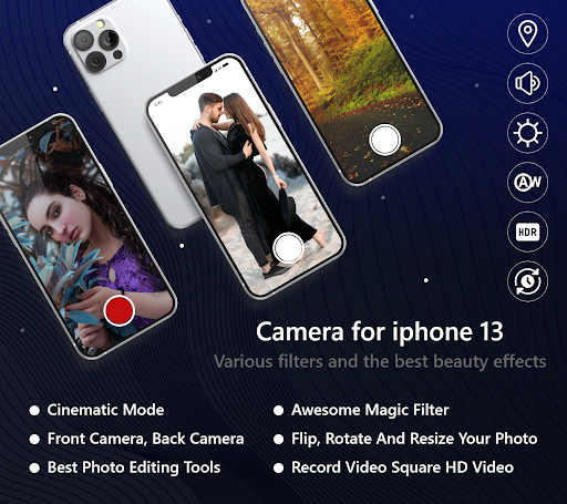 This Camera for iphone 13 - Selfie app has the best camera features like the phone camera, the same like iphone camera in this app filter effect like the iphone camera apps for android also we provide more features like the Camera Filters, brightness, crop, Photo editor, Selfie, create video, square Camera, camera effect, Information about picture and many more.