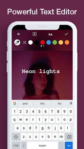 * Text - Simple yet very powerful feature of this app. Comes with 10 predefined color pairings to beautify your texts, to use this feature just click the shuffle icon in text editor.