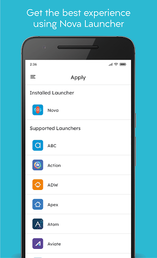 From Pixelful Icon Pack you can select the following launcher: ABC, Action, ADW, Apex, Atom, Aviate, Evie, GO, Holo, Holo HD, LG Home, Lucid, M, Mini, Next, Nougat, Nova, Smart, Solo, V, ZenUI, Zero.