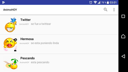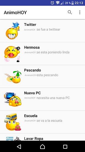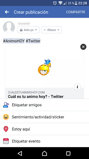 Cuál es tu animo hoy? Selecciona una imagen y publícala, de esta manera tus amigos sabrán tu estado de ánimo. Fanpage = http://www.facebook.com/animohoy Aplicación en Facebook = http://apps.facebook.com/animohoy/