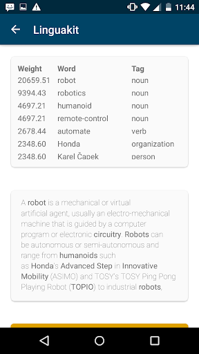 The Keyword Extractor of Linguakit provides you the most important words from a text and it classifies them according to their degree of relevance. It is essential for the immediate detection of topic, for automatic labeling and documentary classification.