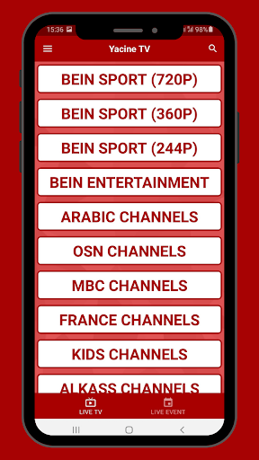 Yacine TV is an application that allows you to watch TV on Android, offering French and Arabic TV channels with content such as sports.
