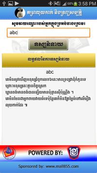 This app is sponsored by mall855.com. The app tell the horoscope of money based on your name. The App will not collect any information from user. The result is shown in Khmer language. The App is developed by SUN Socheat.