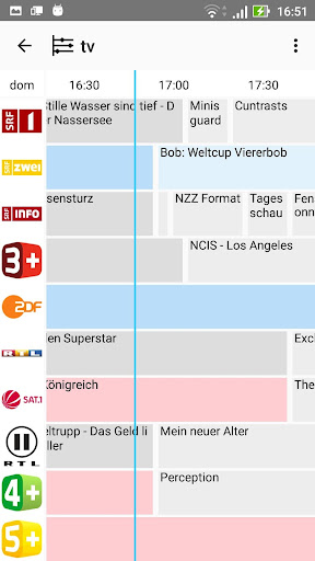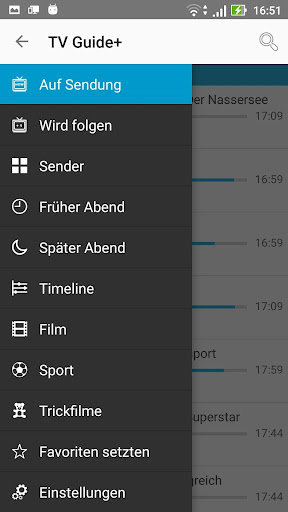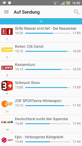 Bei laufenden Sendungen wird ein Balken eingeblendet, der optisch anzeigt, wie lange die Sendung begonnen hat und wie lange es noch bis zum Ende der Sendung dauert. Sie haben eine praktische Zeitleiste für einen Überblick über die Zeitpläne und Abschnitte, in denen nur Filme, Sportsendungen und Zeichentrickfilme aufgeführt sind. Sie können Ihre Lieblingskanäle einstellen, um die Abfrage zu beschleunigen.