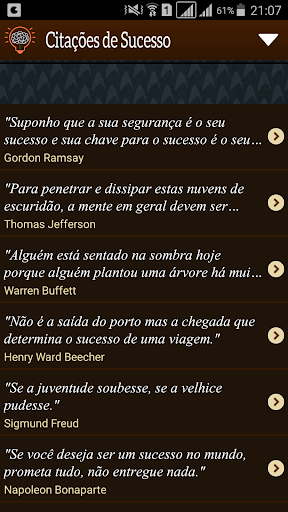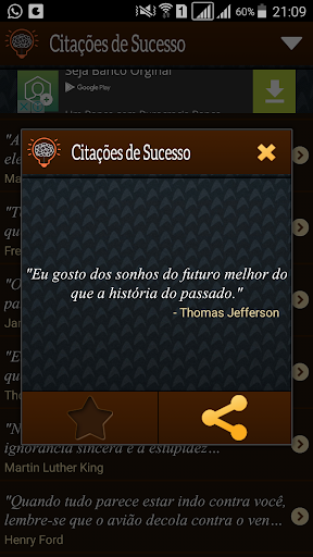 Citações e Frases de Sucesso é um aplicativo para motivá-lo a trabalhar duro e estar entusiasmado para atingir seus objetivos mais ousados e tornar seus sonhos em realidade. Um banco de dados com mais de 1.000 citações de sucesso e mais de 200 autores. Você pode consultar todas as citações diretamente pelos autores ou você pode receber uma citação todos os dias na hora que você especificar. Além disso, você pode compartilhar qualquer citação de diferentes formas (facebook, tweet no Twitter e enviar para o seu amigo pelo WhatsApp, e-mail e SMS). Mantenha o seu entusiasmo em alta.