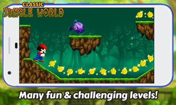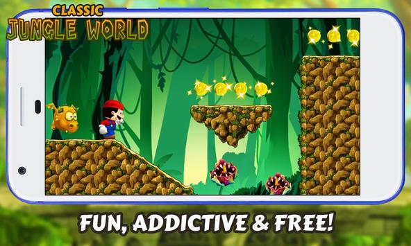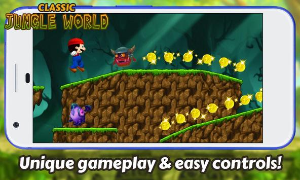 Enjoy the endless fun of one of the best platform games ever. Classic Jungle World game is an amazing adventure game is better than ever and will surely be what retro players looking for. Run and jump around beautiful two-dimension location, walkthrough challenging scenarios and gather as many coins along the road. Similar to other side scrolling adventure that will rock you through levels of challenging running and jumping. This retro-classic will hooked you for hours of gameplay. Crush and destroy all the enemies like piranha plant , Beware of the baby dragon chasing you, do not get caught or the game will be over!