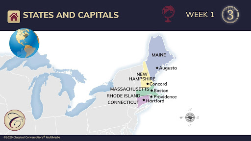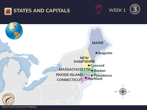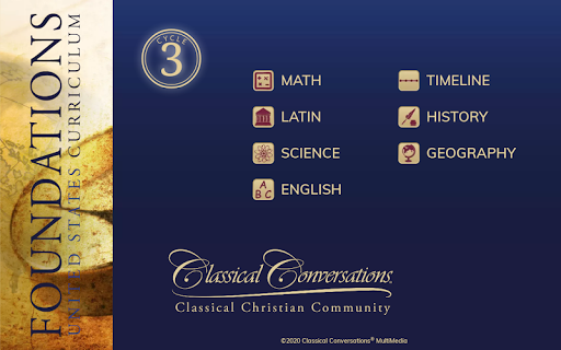 In Cycle 3, Classical Conversations students memorize 161 events and people in the timeline, including the U.S. presidents; 24 U.S. history sentences, including the Preamble to the U.S. Constitution and the Bill of Rights; 120 locations and geographical features in North America (emphasis, the United States); 24 science questions and answers on anatomy and chemistry; multiplication tables (1 through 15), squares, roots, cubes, and basic math laws and conversions; Latin rules and vocabulary, including the text of John 1:1-7 in Latin and English; and English grammar facts, including the principal parts of eleven irregular verbs. This app corresponds to the Foundations Curriculum, Fifth Edition, released in 2018.