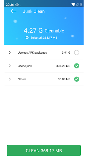 The Cache Cleaner can free up your storage space by removing cache files, temporary files and some other junk files with your permission.
