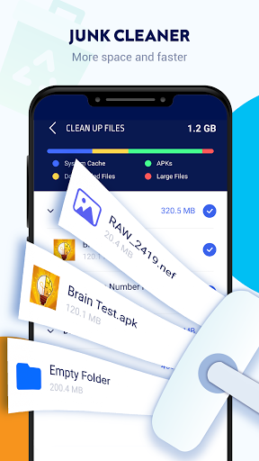 Analyze and safely remove the junk files that take up your memory and storage space. Clean with only 1-tap, free up space and boost phone speed.