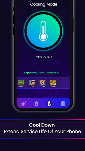 Detect and clean apps that cause overheating. In one tap memory boost, cool down mobile in seconds.