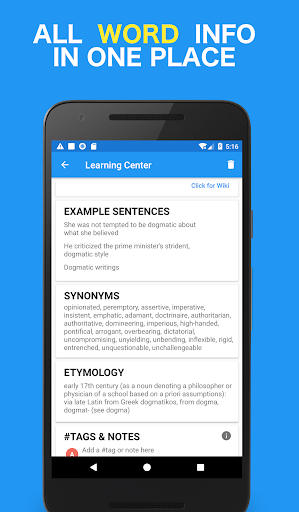 Vocabulary List Define Words & Vocabula is a dictionary vocabulary app. You can create a custom list of words you wish to store. When you click on the words all the words details are displayed including, multiple definitions, a wiki link, synonyms & antonyms, the ability to define words, pronounce words, multiple example sentences and a searchable note section.