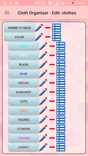 For doing so, this application provides a hierarchy of categories (both built-in and expandable by user) to which the user can assign herhis items (clothes, shoes or bags).