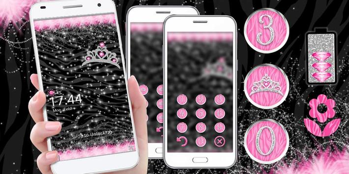 The Diva Hot Pink Zebra Locker Theme is a free girl theme that will make your phone lock screen fun and sparkle. The zebra theme has a black and white zebra print wallpaper edged with a diamond bar and a cute pink feather boa. Sparkles dazzle the wallpaper of this zebra locker theme. Unlock your phone using the pink zebra and silver sparkle glitter numbers. Cute tiaras fill the numbers until ready to use. A custom font was selected to match this zebra locker. If you like pink zebra lockers, you’ll love this! Download the Hot Pink Zebra Locker Theme and feel like a diva everyday ❤