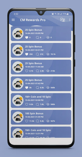 CM Rewards Pro is the best app to offer free spins and coins of CM game. We provide daily updates for free spin, coins and other events offered by CM game. Daily CM Rewards app help you to get free spin rewards, coin rewards, card boom event, set blast event, golden card trade exchange, balloon frenzy, Coin Craze event etc. CM Rewards Pro is now available in multiple languages.