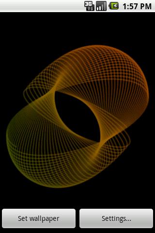 The free Spyro Live Wallpaper displays an animated spirograph. You can tap on the screen to alter the curve. You can choose to use your current background wallpaper or select one of the background shadings, whether you would like to have 2D or 3D effect and four different base Spyro curves. The color shading, accuracy, speed and curve stroke can be altered as desired. Double tap on the Spyro to save it as an image.