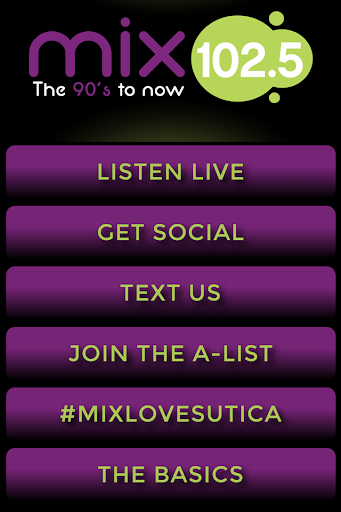 Listen to your favorite 90's to now radio station from the Mohawk Valley on the MIX 102.5 app. Stay connected, stream live radio, join the A-List and more! Put the MIX 102.5 App in your pocket and listen to your favorite 90's to now station wherever you go.