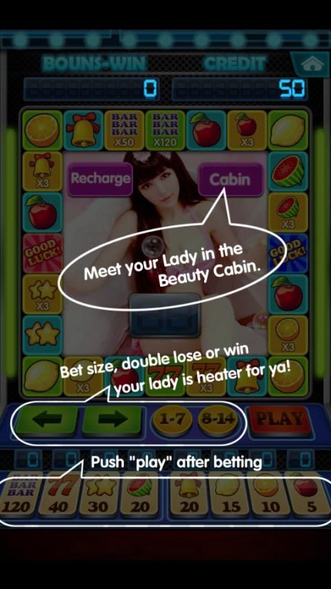 Beauty slot machines, arcade perfect simulation of real fruit machine, producing exquisite, give players exciting experience, so you do not have to play the city will be able to experience the fun of fruit machines anywhere! After the apples, oranges, bells, watermelons, 77, binary, BAR and other betting games fruit light elements, players use coins to bet they want the fruit, and then press the "PLAY" button, light fruit begins to rotate, when the rotation when stopped, if parked in the players bet on fruits, players will get the corresponding game currency. In the case of the winning players, but also the use of the winning district game currency to bet guess so, guess so great irritation, won the doubles, lose it cleared. Earn coins can watch all kinds of beauty video , great joy from the beauty slot machines started!