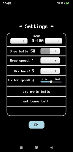 *This is a lottery simulator with a physical engine. *You can draw from 1 to 100(Pick up 50 balls). (Bonus ball option included.) *Exclude or include numbers. *Save option included.