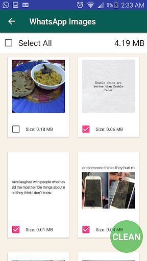 Removing or cleaning your shared files, one by one, can be tiresome and time-consuming. With WhatsApp Media Cleaner all you have to do is just simply tap on the clean button, all of the selected files will be deleted from your internal storage!