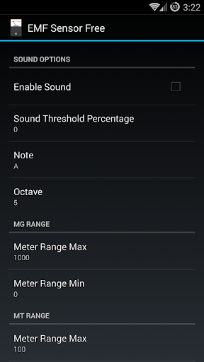 Custom color values can be set for the text. Sound can be enabled and customized in preferences, default is off. This will play a tone at a rate determined by the EMF reading, similar to a Geiger counter.